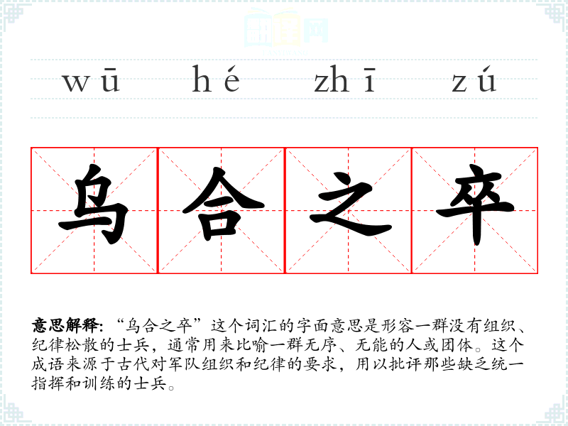 “乌合之卒”这个词汇的字面意思是形容一群没有组织、纪律松散的士兵,通常用来比喻一群无序、无能的人或团体。这个成语来源于古代对军队组织和纪律的要求,用以批评那些缺乏统一指挥和训练的士兵。