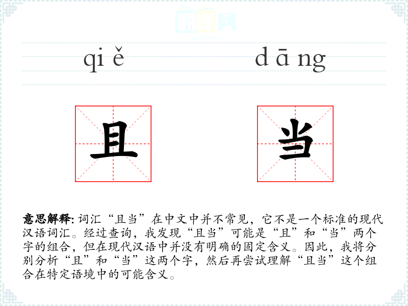 词汇“且当”在中文中并不常见,它不是一个标准的现代汉语词汇。经过查询,我发现“且当”可能是“且”和“当”两个字的组合,但在现代汉语中并没有明确的固定含义。因此,我将分别分析“且”和“当”这两个字,然后再尝试理解“且当”这个组合在特定语境中的可能含义。
