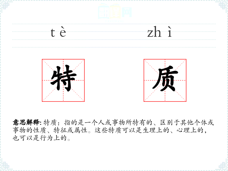 特质:指的是一个人或事物所特有的、区别于其他个体或事物的性质、特征或属性。这些特质可以是生理上的、心理上的,也可以是行为上的。