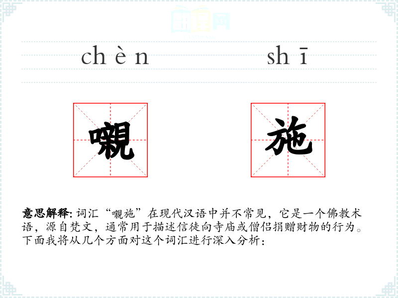 词汇“嚫施”在现代汉语中并不常见,它是一个**术语,源自梵文,通常用于描述信徒向寺庙或僧侣捐赠财物的行为。下面我将从几个方面对这个词汇进行深入分析: