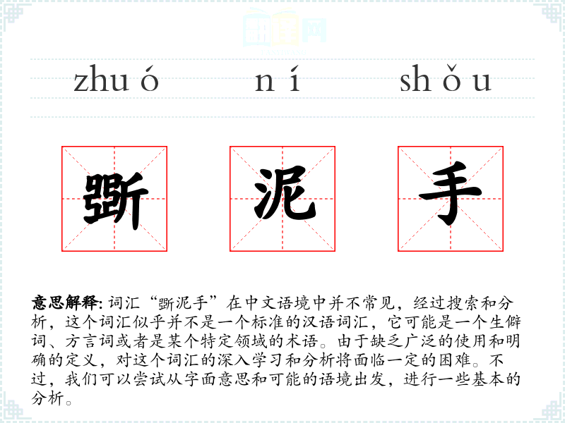 词汇“斲泥手”在中文语境中并不常见,经过搜索和分析,这个词汇似乎并不是一个标准的汉语词汇,它可能是一个生僻词、方言词或者是某个特定领域的术语。由于缺乏广泛的使用和明确的定义,对这个词汇的深入学习和分析将面临一定的困难。不过,我们可以尝试从字面意思和可能的语境出发,进行一些基本的分析。