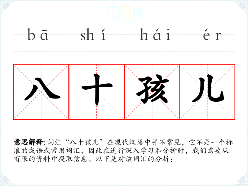 词汇“八十孩儿”在现代汉语中并不常见,它不是一个标准的成语或常用词汇,因此在进行深入学*和分析时,我们需要从有限的资料中提取信息。以下是对该词汇的分析: