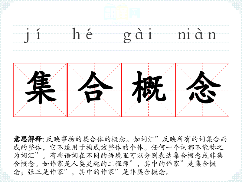 1.反映事物的集合体的概念。如词汇”反映所有的词集合而成的整体,它不适用于构成该整体的个体。任何一个词都不能称之为词汇”。有些语词在不同的语境里可以分别表达集合概念或非集合概念。如作家是人类灵魂的工程师”,其中的作家”是集合概念;张三是作家”,其中的作家”是非集合概念。