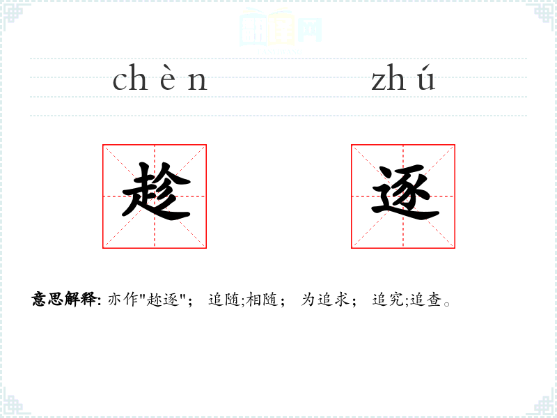 亦作"趂逐"; 追随;相随; 为追求; 追究;追查。