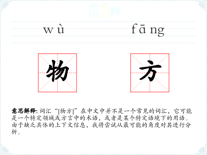 词汇“[物方]”在中文中并不是一个常见的词汇,它可能是一个特定领域或方言中的术语,或者是某个特定语境下的用语。由于缺乏具体的上下文信息,我将尝试从最可能的角度对其进行分析。