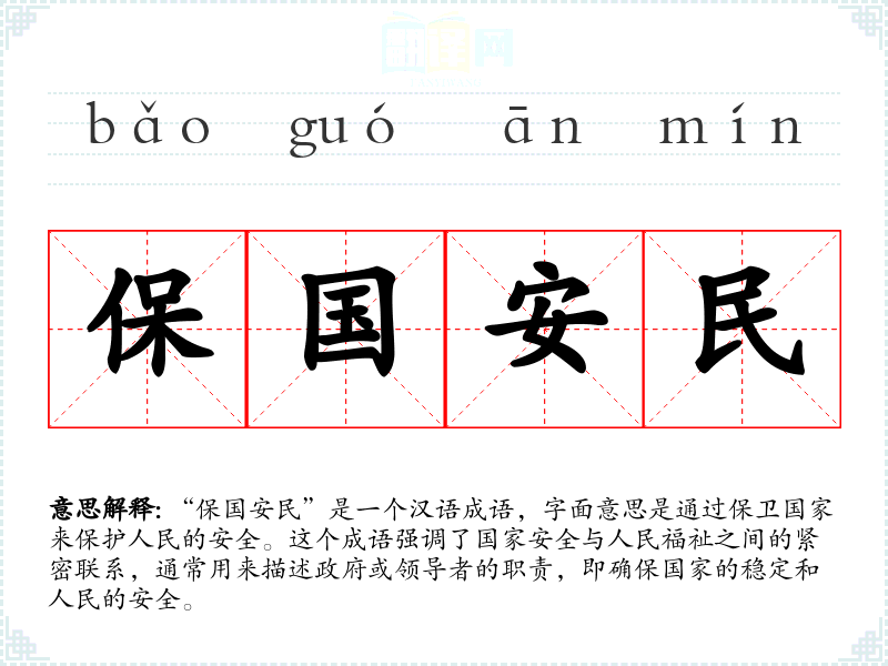 在英语中,类似的表达可能是“protect the nation and its people”,但这个表达没有“保国安民”这个成语所蕴含的深刻文化和历史背景。