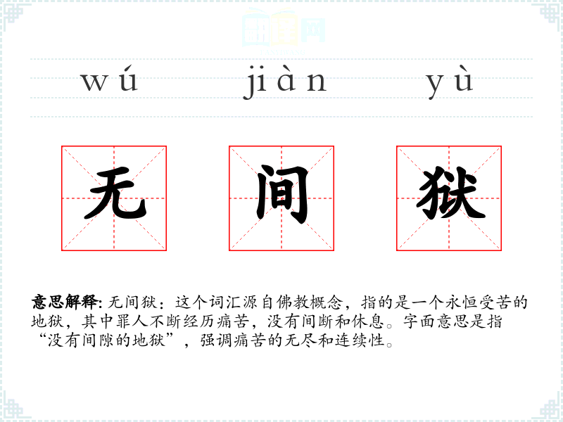 无间狱:这个词汇源自**概念,指的是一个永恒受苦的地狱,其中罪人不断经历痛苦,没有间断和休息。字面意思是指“没有间隙的地狱”,强调痛苦的无尽和连续性。