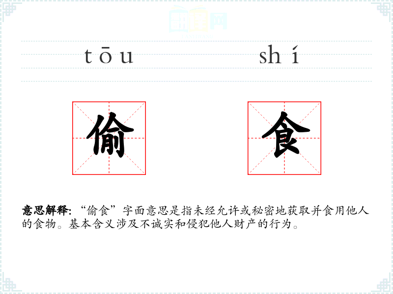 “偷食”字面意思是指未经允许或秘密地获取并食用他人的食物。基本含义涉及不诚实和侵犯他人财产的行为。