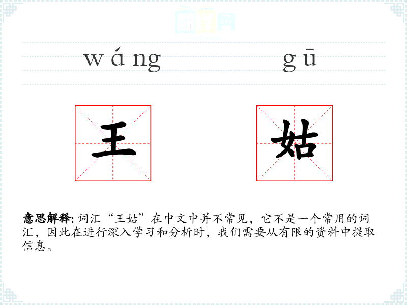 词汇“王姑”在中文中并不常见,它不是一个常用的词汇,因此在进行深入学*和分析时,我们需要从有限的资料中提取信息。