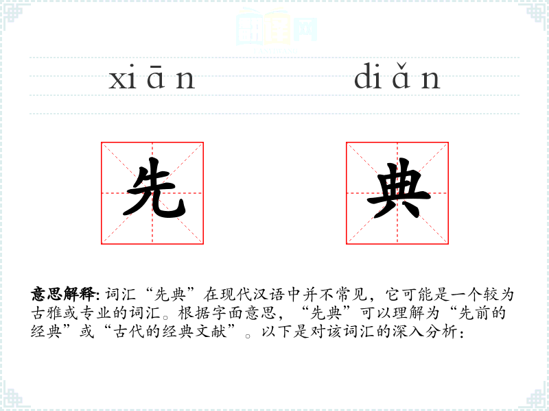 词汇“先典”在现代汉语中并不常见,它可能是一个较为古雅或专业的词汇。根据字面意思,“先典”可以理解为“先前的经典”或“古代的经典文献”。以下是对该词汇的深入分析: