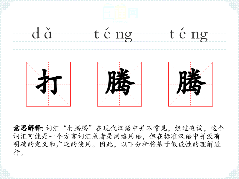 词汇“打腾腾”在现代汉语中并不常见,经过查询,这个词汇可能是一个方言词汇或者是网络用语,但在标准汉语中并没有明确的定义和广泛的使用。因此,以下分析将基于假设性的理解进行。