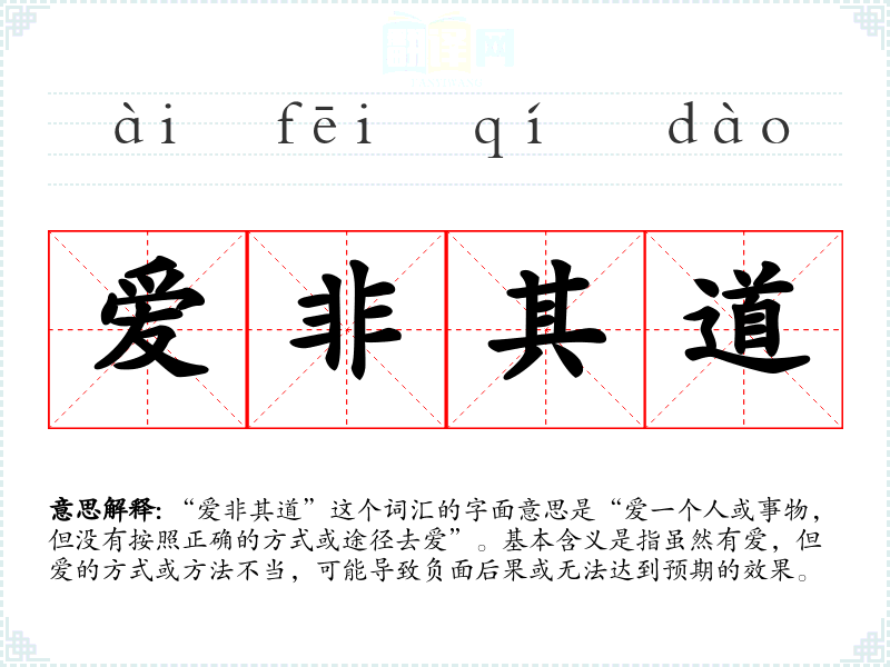 “爱非其道”这个词汇的字面意思是“爱一个人或事物,但没有按照正确的方式或途径去爱”。基本含义是指虽然有爱,但爱的方式或方法不当,可能导致负面后果或无法达到预期的效果。