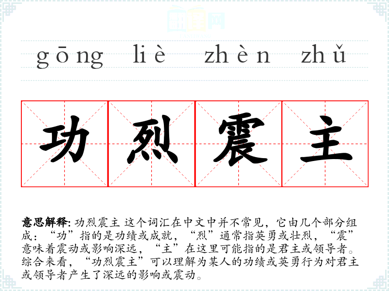 功烈震主 这个词汇在中文中并不常见,它由几个部分组成:“功”指的是功绩或成就,“烈”通常指英勇或壮烈,“震”意味着震动或影响深远,“主”在这里可能指的是君主或领导者。综合来看,“功烈震主”可以理解为某人的功绩或英勇行为对君主或领导者产生了深远的影响或震动。