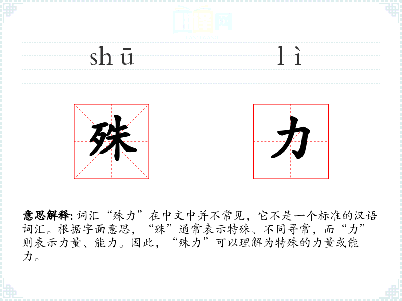 词汇“殊力”在中文中并不常见,它不是一个标准的汉语词汇。根据字面意思,“殊”通常表示特殊、不同寻常,而“力”则表示力量、能力。因此,“殊力”可以理解为特殊的力量或能力。