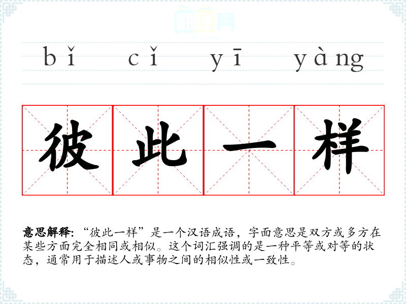 “彼此一样”是一个汉语成语,字面意思是双方或多方在某些方面完全相同或相似。这个词汇强调的是一种平等或对等的状态,通常用于描述人或事物之间的相似性或一致性。