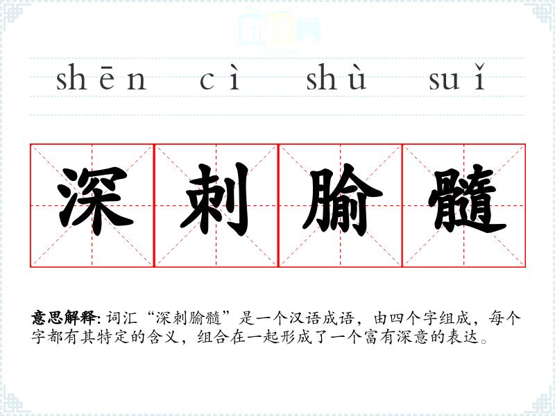 词汇“深刺腧髓”是一个汉语成语,由四个字组成,每个字都有其特定的含义,组合在一起形成了一个富有深意的表达。