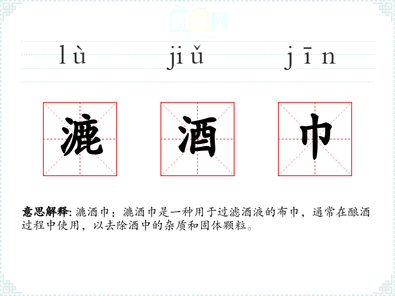同义词:滤布、滤巾、滤网 反义词:无(漉酒巾是一个特定用途的词汇,没有直接的反义词)