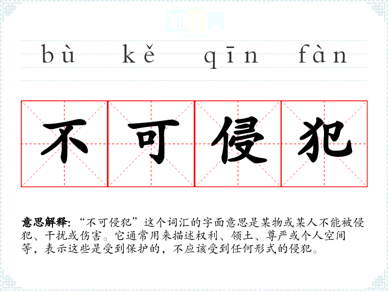 “不可侵犯”这个词汇的字面意思是某物或某人不能被侵犯、干扰或伤害。它通常用来描述权利、领土、尊严或个人空间等,表示这些是受到保护的,不应该受到任何形式的侵犯。