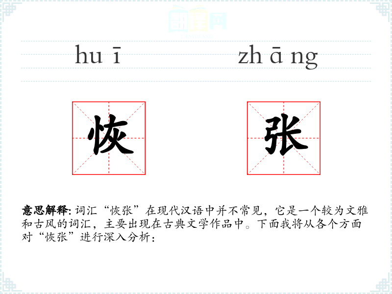 词汇“恢张”在现代汉语中并不常见,它是一个较为文雅和古风的词汇,主要出现在古典文学作品中。下面我将从各个方面对“恢张”进行深入分析:
