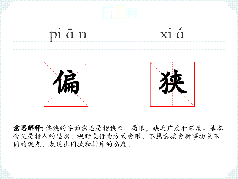 - 专业领域:在心理学或社会学中,偏狭可能与认知偏差或社会排斥现象相关,如“研究显示,偏狭的社会环境会导致个体心理健康问题。”