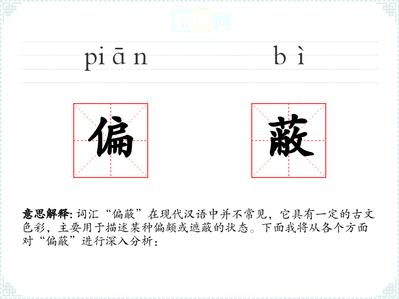 “偏蔽”由两个字组成:“偏”意味着偏向、不公正或不全面;“蔽”则指遮蔽、蒙蔽或阻碍。结合起来,“偏蔽”通常指因偏见或无知而导致的信息不全或判断不公。