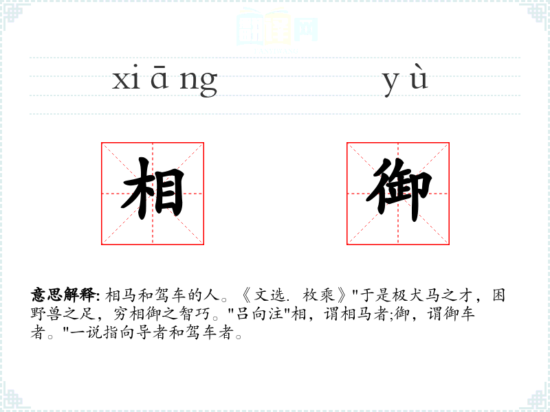 相马和驾车的人。《文选.枚乘》"于是极犬马之才,困野兽之足,穷相御之智巧。"吕向注"相,谓相马者;御,谓御车者。"一说指向导者和驾车者。
