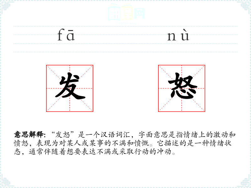 “发怒”由“发”和“怒”两个字组成。在古代汉语中,“发”有释放、表达的意思,“怒”则指愤怒的情绪。随着语言的发展,这两个字结合在一起,形成了描述情绪释放的词汇。