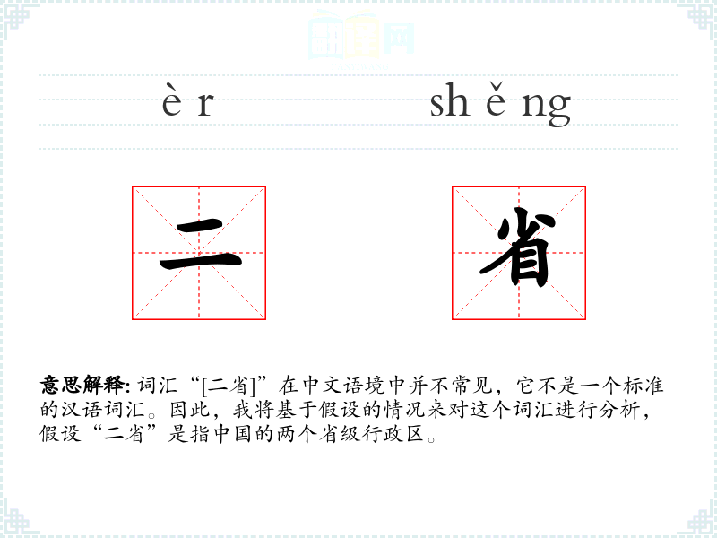 词汇“[二省]”在中文语境中并不常见,它不是一个标准的汉语词汇。因此,我将基于假设的情况来对这个词汇进行分析,假设“二省”是指**的两个省级行政区。