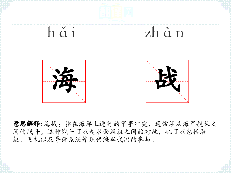 - 反义词:与海战相对的词汇可能是“和平”、“休战”或“停火”,这些词汇强调的是没有战斗或冲突的状态。