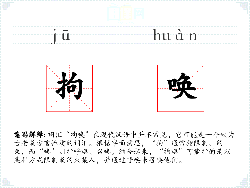 词汇“拘唤”在现代汉语中并不常见,它可能是一个较为古老或方言性质的词汇。根据字面意思,“拘”通常指限制、约束,而“唤”则指呼唤、召唤。结合起来,“拘唤”可能指的是以某种方式限制或约束某人,并通过呼唤来召唤他们。