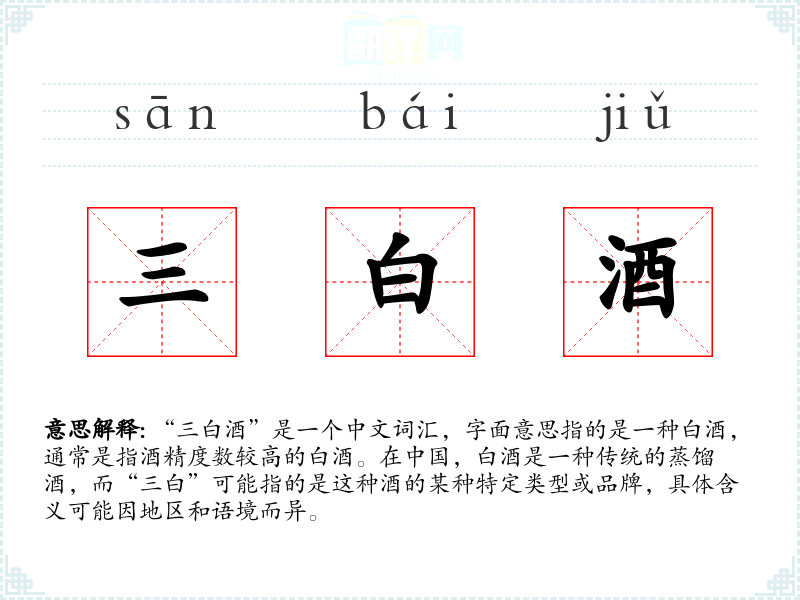 “三白酒”是一个中文词汇,字面意思指的是一种白酒,通常是指酒精度数较高的白酒。在**,白酒是一种传统的蒸馏酒,而“三白”可能指的是这种酒的某种特定类型或品牌,具体含义可能因地区和语境而异。