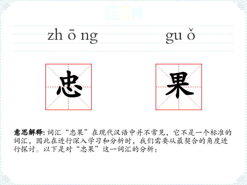由于“忠果”不是一个标准词汇,它在不同语言或文化中的对应词汇及其使用情况不明确。