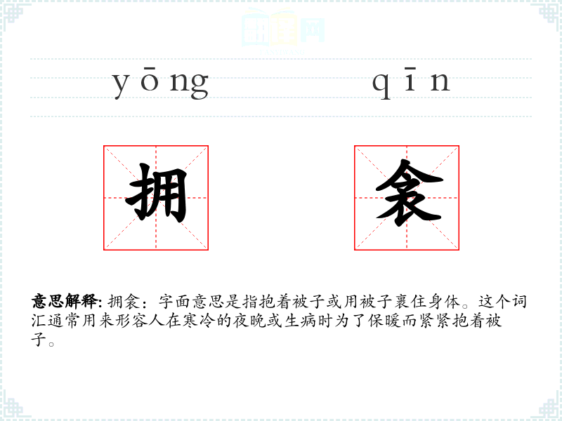 词源:“拥”字在古代汉语中意为抱持,“衾”指被子。这两个字组合在一起,形成了“拥衾”这个词汇。