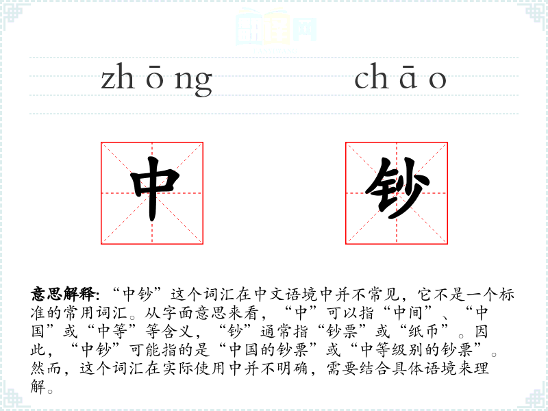 由于“中钞”不是一个常用词汇,它的词源和演变并不明确。它可能是由“中”和“钞”两个字组合而成,用来指代中国的纸币。