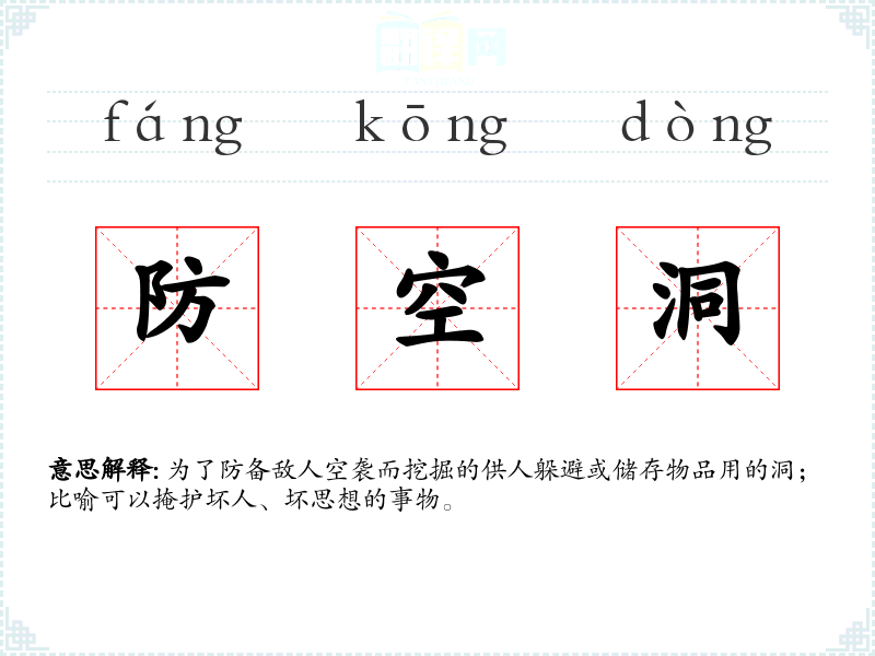 为了防备敌人空袭而挖掘的供人躲避或储存物品用的洞;比喻可以掩护坏人、坏思想的事物。