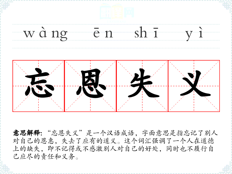 “忘恩失义”是一个汉语成语,字面意思是指忘记了别人对自己的恩惠,失去了应有的道义。这个词汇强调了一个人在道德上的缺失,即不记得或不感激别人对自己的好处,同时也不履行自己应尽的责任和义务。