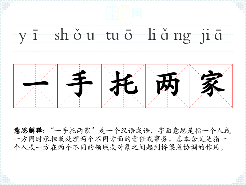 “一手托两家”是一个汉语成语,字面意思是指一个人或一方同时承担或处理两个不同方面的责任或事务。基本含义是指一个人或一方在两个不同的领域或对象之间起到桥梁或协调的作用。