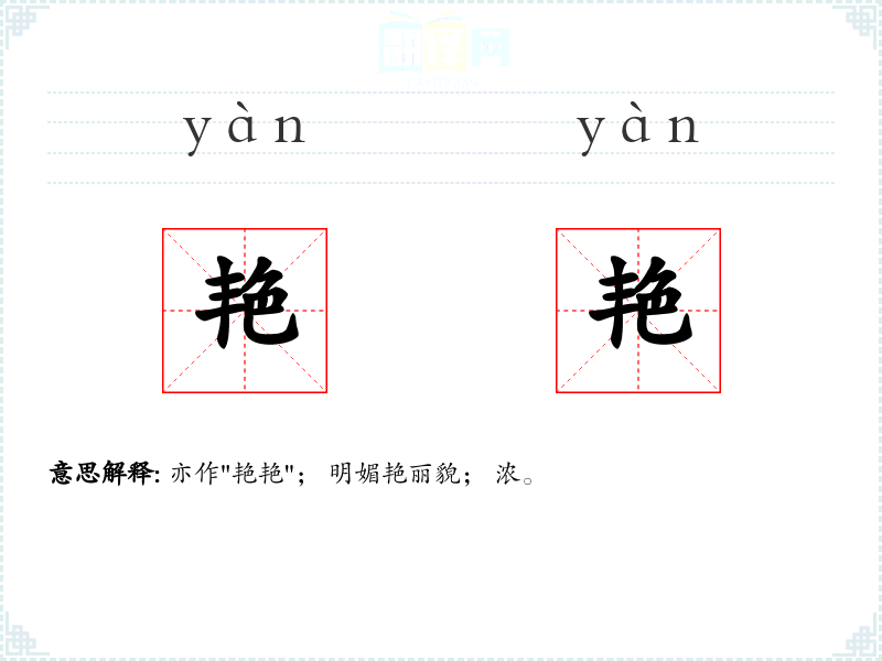 亦作"艳艳"; 明媚艳丽貌; 浓。