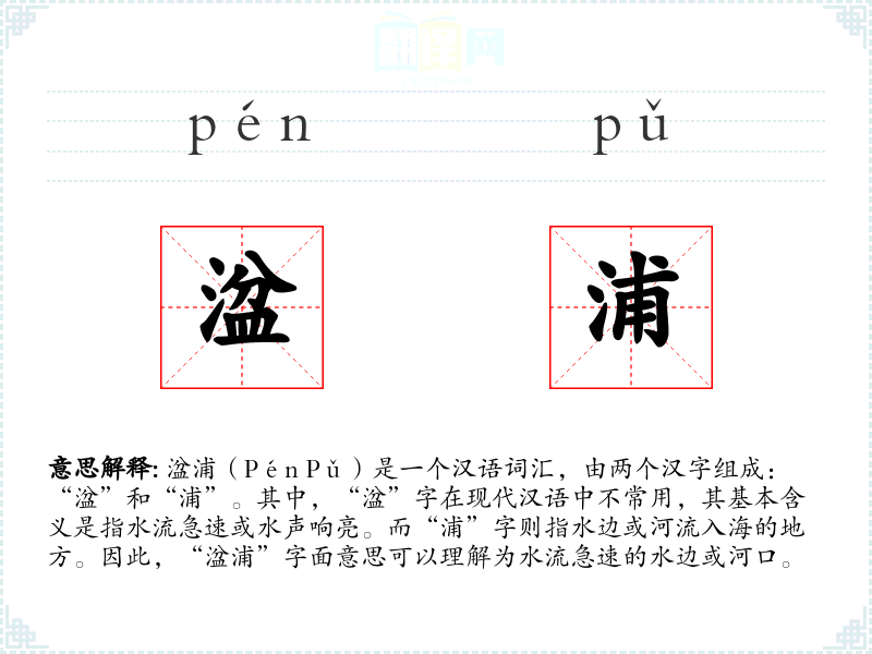 湓浦(Pén Pǔ)是一个汉语词汇,由两个汉字组成:“湓”和“浦”。其中,“湓”字在现代汉语中不常用,其基本含义是指水流急速或水声响亮。而“浦”字则指水边或河流入海的地方。因此,“湓浦”字面意思可以理解为水流急速的水边或河口。