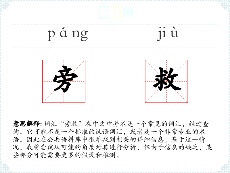 词汇“旁救”在中文中并不是一个常见的词汇,经过查询,它可能不是一个标准的汉语词汇,或者是一个非常专业的术语,因此在公共语料库中很难找到相关的详细信息。基于这一情况,我将尝试从可能的角度对其进行分析,但由于信息的缺乏,某些部分可能需要更多的假设和推测。