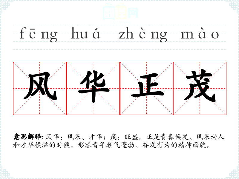 风华:风采、才华;茂:旺盛。正是青春焕发、风采动人和