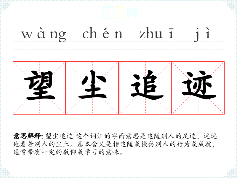 望尘追迹 这个词汇的字面意思是追随别人的足迹,远远地看着别人的尘土。基本含义是指追随或模仿别人的行为或成就,通常带有一定的敬仰或学*的意味。