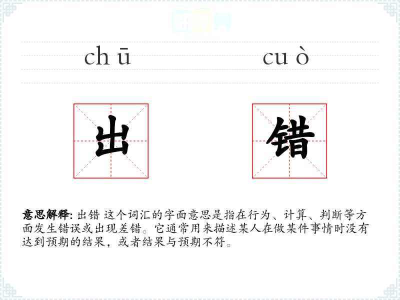 出错 这个词汇的字面意思是指在行为、计算、判断等方面发生错误或出现差错。它通常用来描述某人在做某件事情时没有达到预期的结果,或者结果与预期不符。
