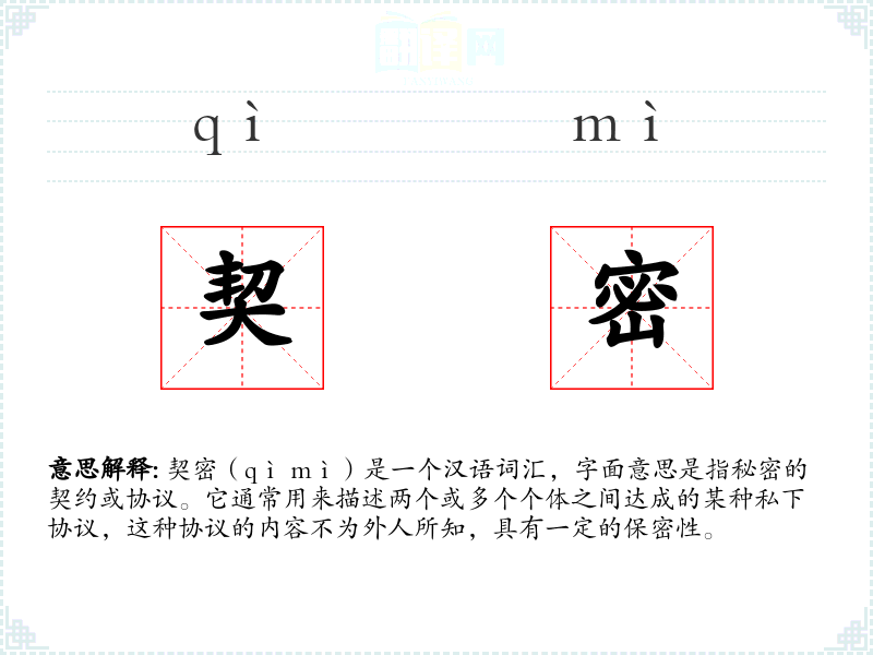 契密(qì mì)是一个汉语词汇,字面意思是指秘密的契约或协议。它通常用来描述两个或多个个体之间达成的某种私下协议,这种协议的内容不为外人所知,具有一定的保密性。