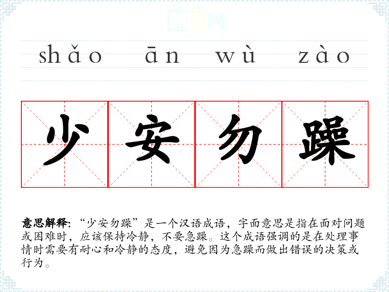 “少安勿躁”是一个汉语成语,字面意思是指在面对问题或困难时,应该保持冷静,不要急躁。这个成语强调的是在处理事情时需要有耐心和冷静的态度,避免因为急躁而做出错误的决策或行为。