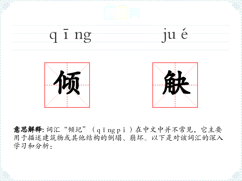 词汇“倾圮”(qīng pǐ)在中文中并不常见,它主要用于描述建筑物或其他结构的倒塌、崩坏。以下是对该词汇的深入学*和分析: