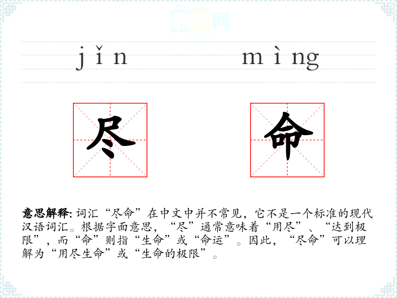 词汇“尽命”在中文中并不常见,它不是一个标准的现代汉语词汇。根据字面意思,“尽”通常意味着“用尽”、“达到极限”,而“命”则指“生命”或“命运”。因此,“尽命”可以理解为“用尽生命”或“生命的极限”。