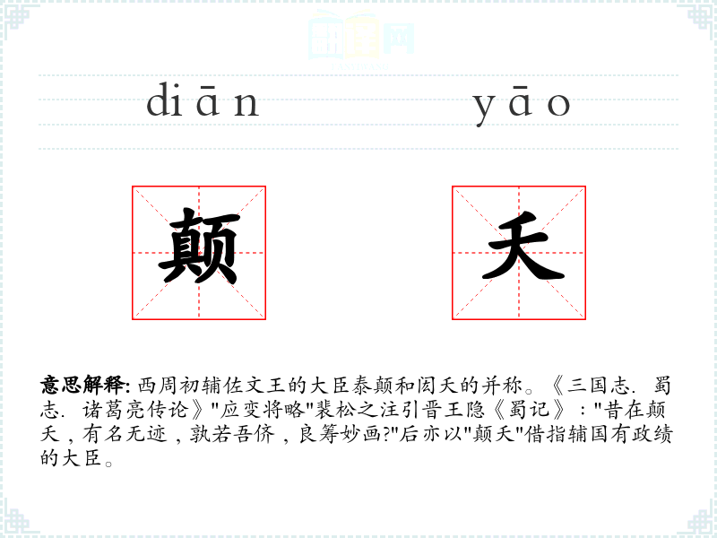 "裴松之注引晋王隐《蜀记》﹕"昔在颠夭﹐有名无迹﹐孰若吾侪﹐良筹妙画?"后亦以"颠夭"借指辅国有政绩的大臣。