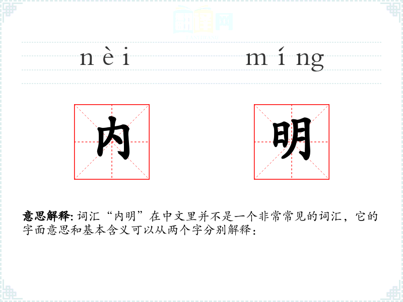词汇“内明”在中文里并不是一个非常常见的词汇,它的字面意思和基本含义可以从两个字分别解释:
