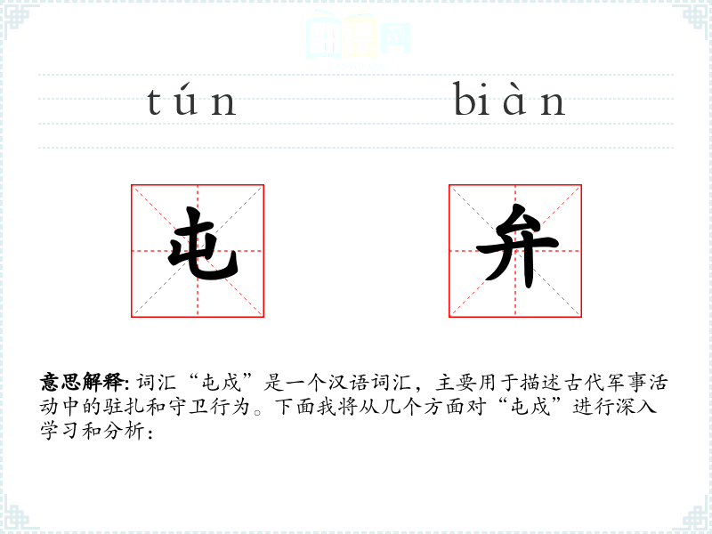 词汇“屯戍”是一个汉语词汇,主要用于描述古代军事活动中的驻扎和守卫行为。下面我将从几个方面对“屯戍”进行深入学*和分析: